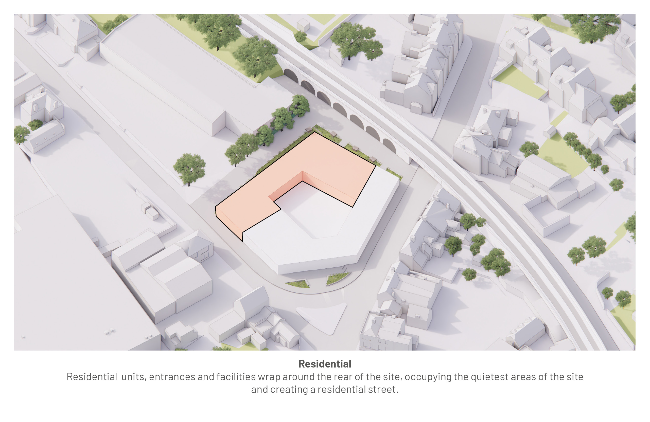The masterplan emphasises the importance of ‘embracing Strood’s historic role as a productive engine’, and creating an ‘attractive place to live’. A 5 sided building introduces pockets of new public space at ground floor, while directing residential views towards the historic buildings, parks and the river nearby. The High Street is extended with new retail and commercial units, drawing people up to its culmination outside seven newly renovated railway arches.
